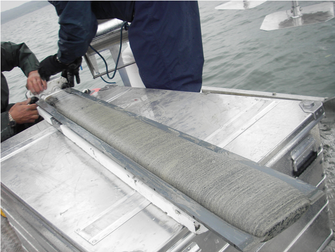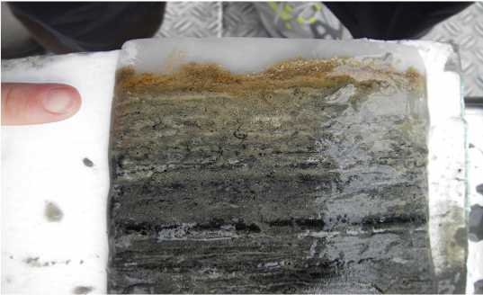 Top of the 148 cm long freezecore, showing the perfectly preserved sediment-water interface (brownish-yellow, due to the higher oxygen content in pore-water compared to the blackish grey anaerobic older sediments). The top of the black layer is 1993, where a high sediment discharge event buried sediments from 1992 which contained high organic contents due to low oxygen concentration in the summer water column.