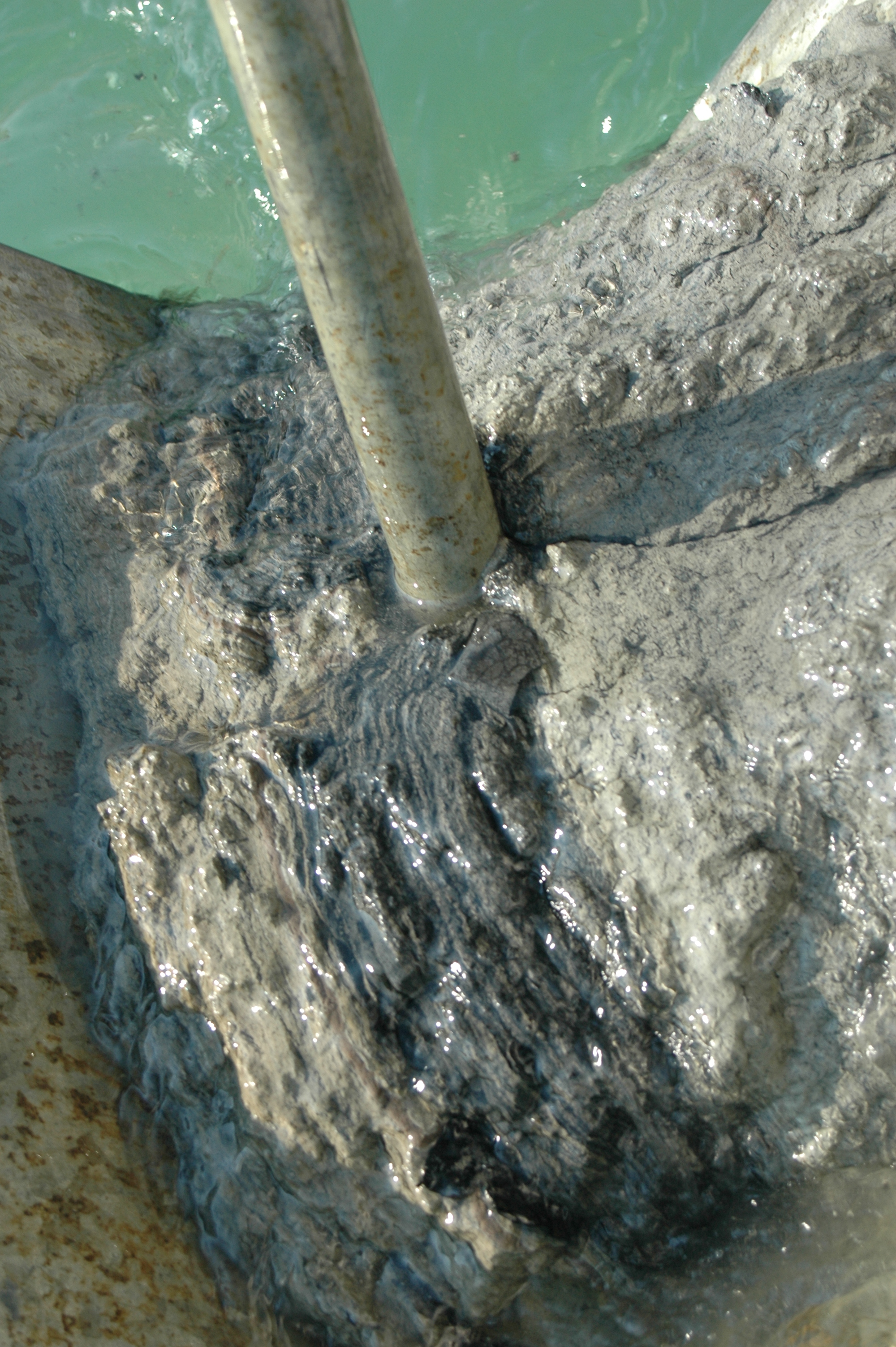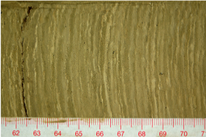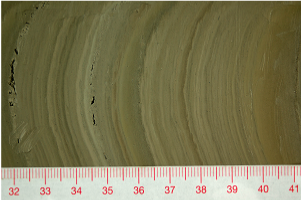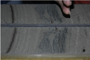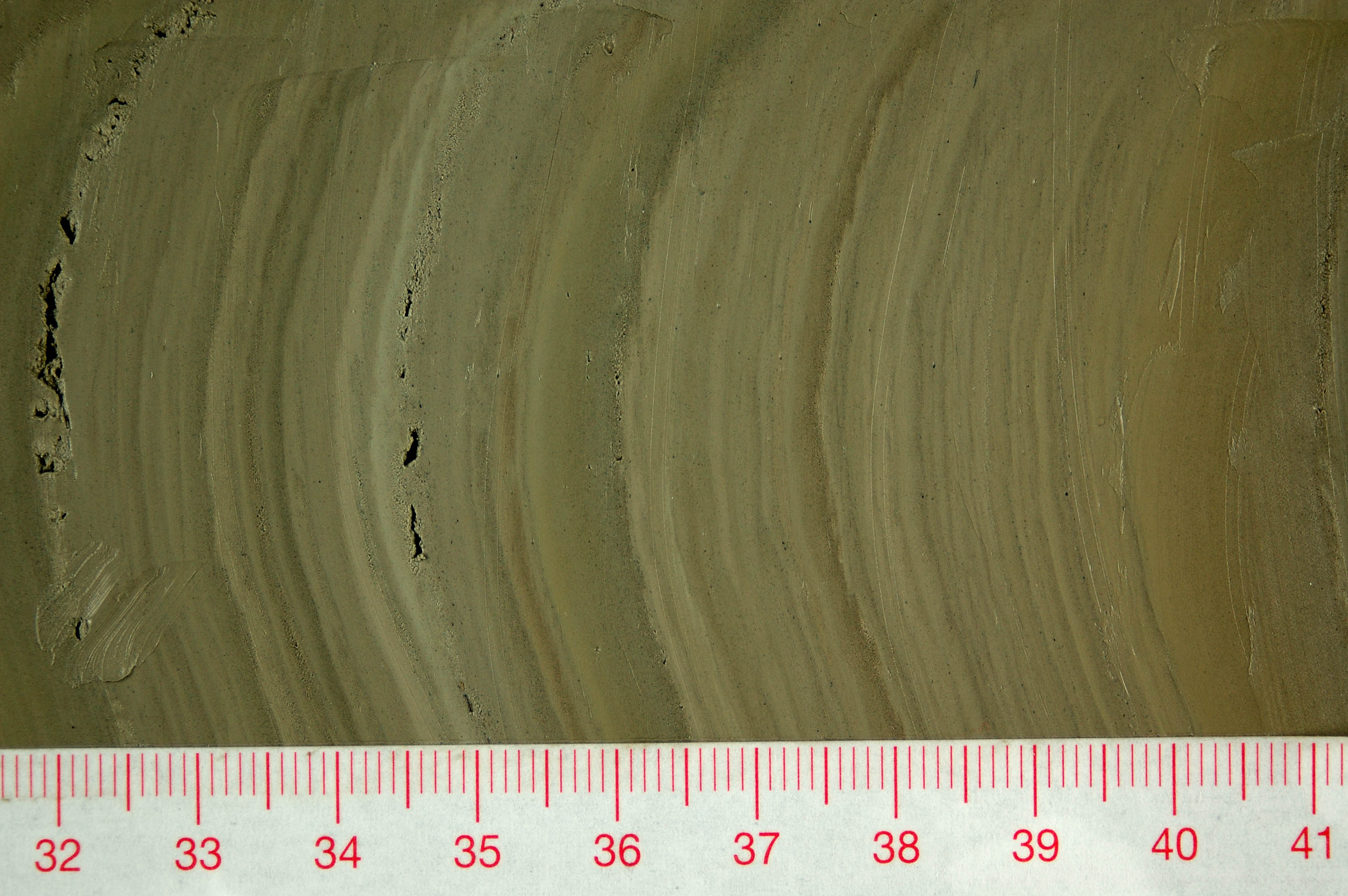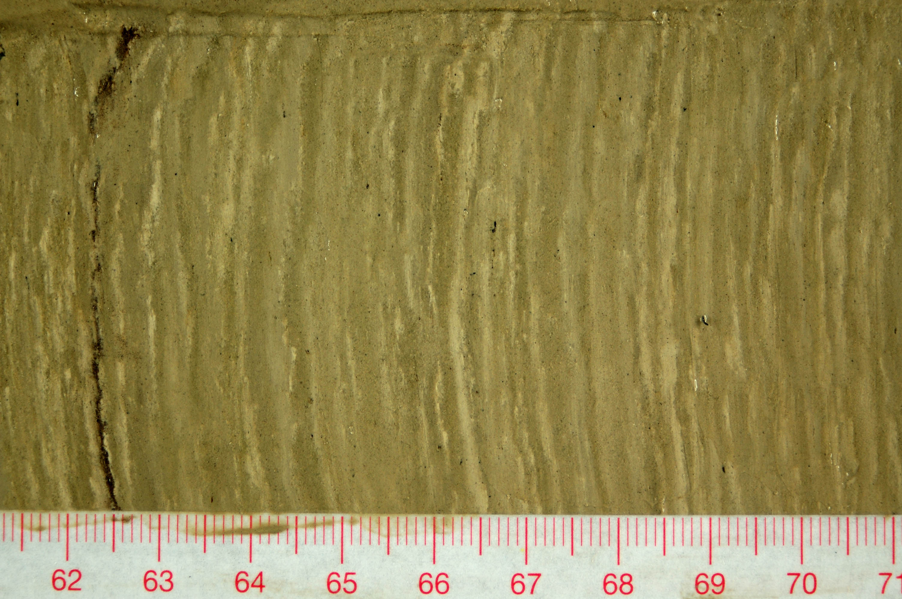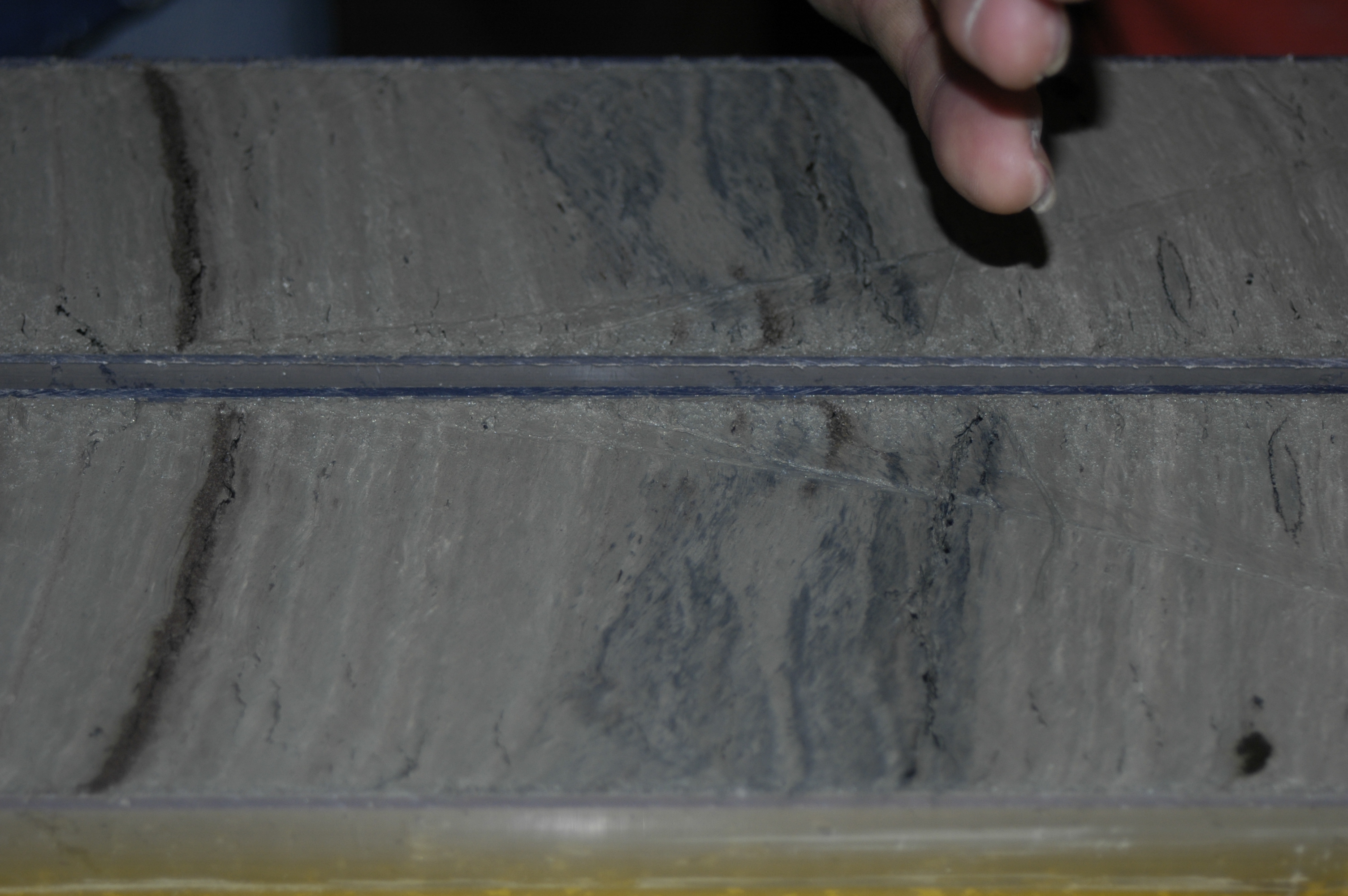 Dark-grey/white lamination just after opening the core. Brownish layer to the left is an high discharge event (flood layer).